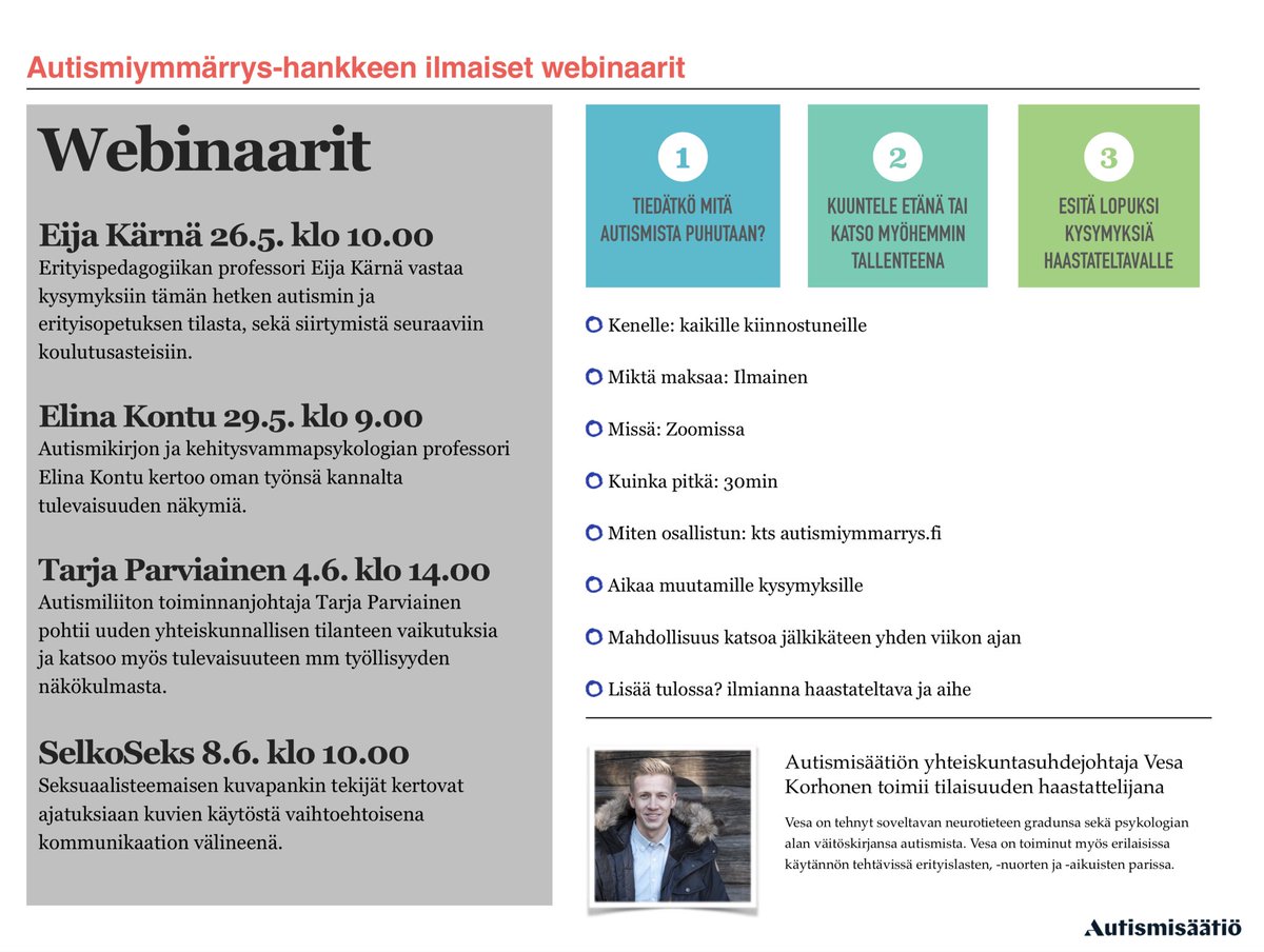 RT @Autismiymmarrys: Ilmaisia webinaareja autismista kts lisää ja ilmoittaudu https://t.co/tJYSDg9wR3 #autismi #autismiymmärrys @Autismisaatio @Autismiliitto @ParviainenTarja @ElinaKontu #selkoseks #eijakärnä https://t.co/7SfhrDO7JT
