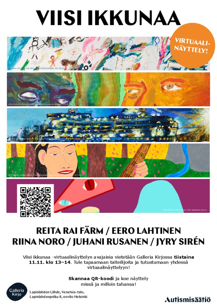 Viisi ikkunaa -virtuaalinäyttely avaa Autismisäätiön uuden verkkogallerian, Galleria Kirjon, ja toimii sen ensimmäisenä näyttelynä. Virtuaalisella Galleria Kirjolla on oma näyttelyohjelma, joka esittelee teoksia Autismisäätiön taidekokoelmasta ja taidetoimintaan osallistuvilta taiteilijoilta.